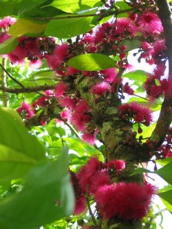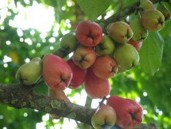 The Malaysian Apple tree belongs to the Eugenia family, of up to 1000 species. The fruit is eaten either ripe (red skin), or semi green with salt. When ripe, the skin is red whilst the fruit is white (similar to red apples).